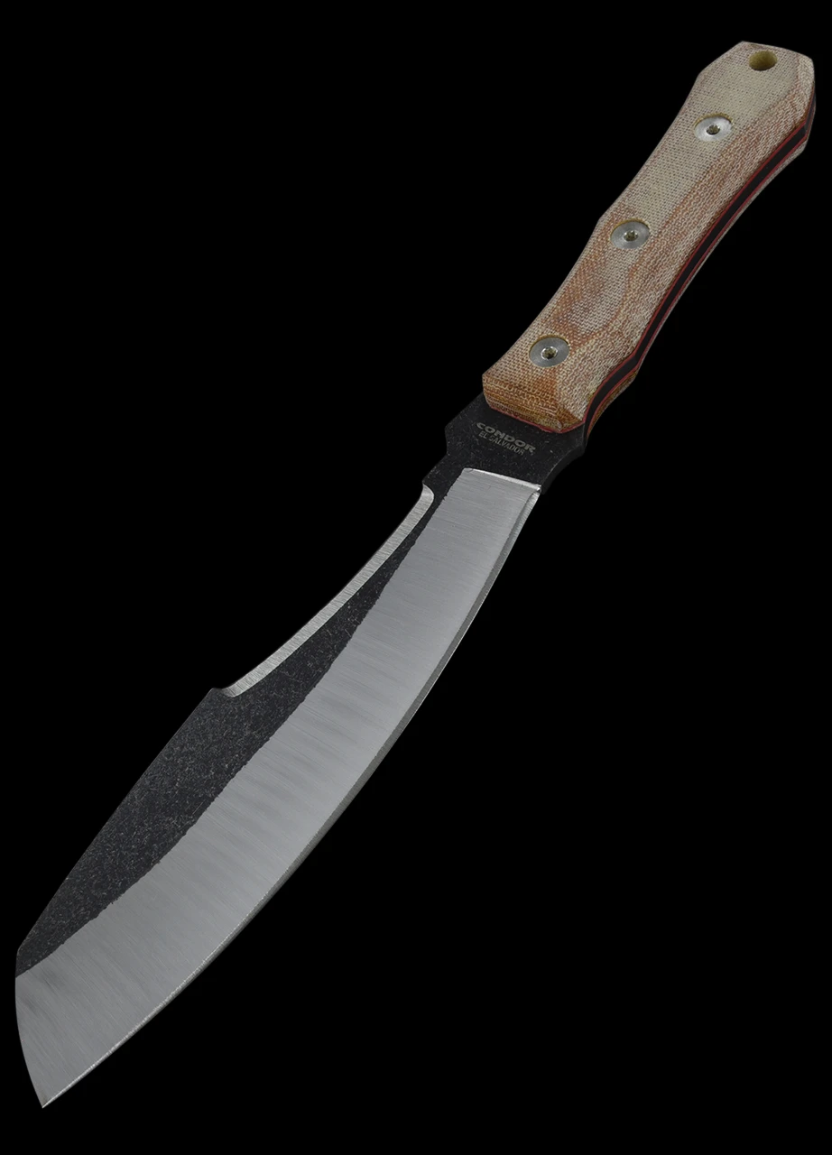 The Condor Mountain Pass Surveyor Knife features a stainless steel blade with a two-tone Condor Classic finish. It has a curved Wharcliff shape with a false edge running half the length of the blade. Despite the lack of ultra sharp edge it does, however, have enough “bite” to debark branches or get a spark out of a fire rod. The handle is made up of two slabs of tan canvas micarta with red liners. This extremely practical tool is supplied with a leather sheath.