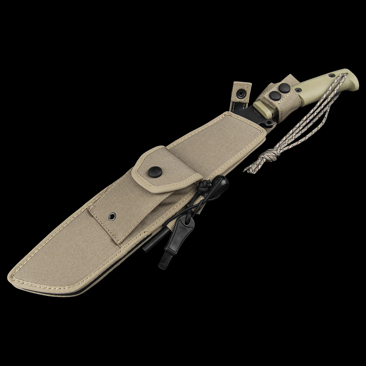 It comes with a desert cordura sheath with MOLLE system, a safety carry shoulder belt, a mini puch containing a paracord with flammable filament, which can be used in case of emergency and/or difficult climatic conditions, and a Firesteel for lighting fires.