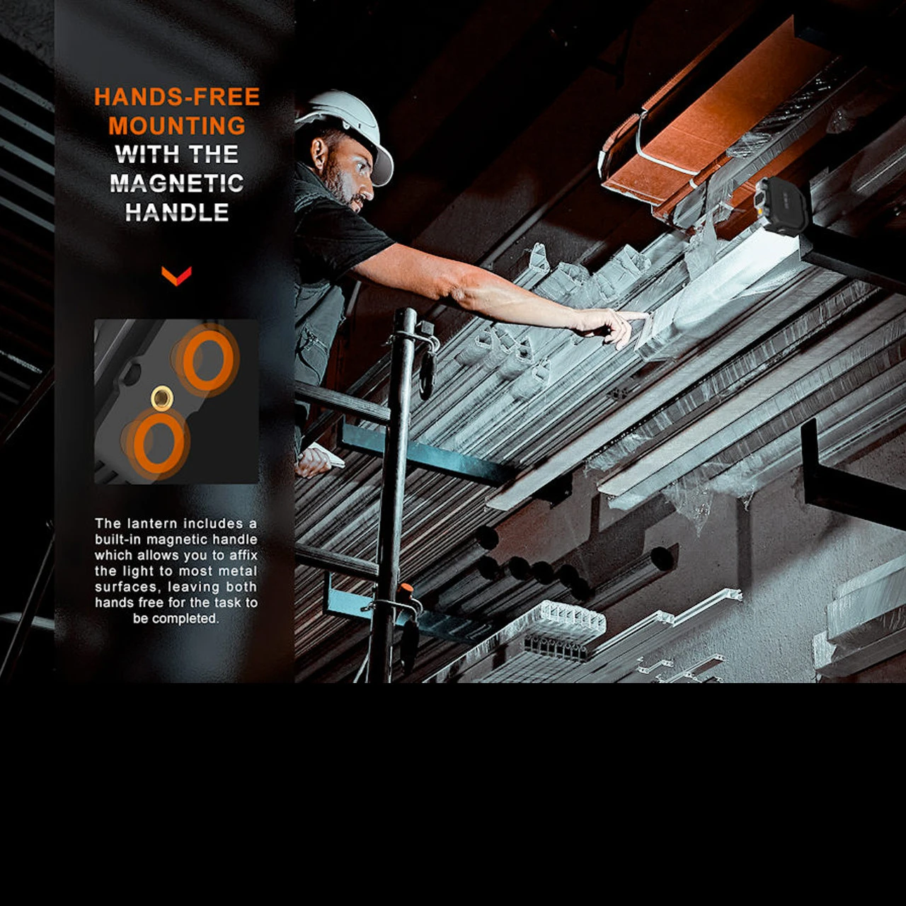 - Magnetic 360 degree swivel handle with tripod socket for convenient mounting
