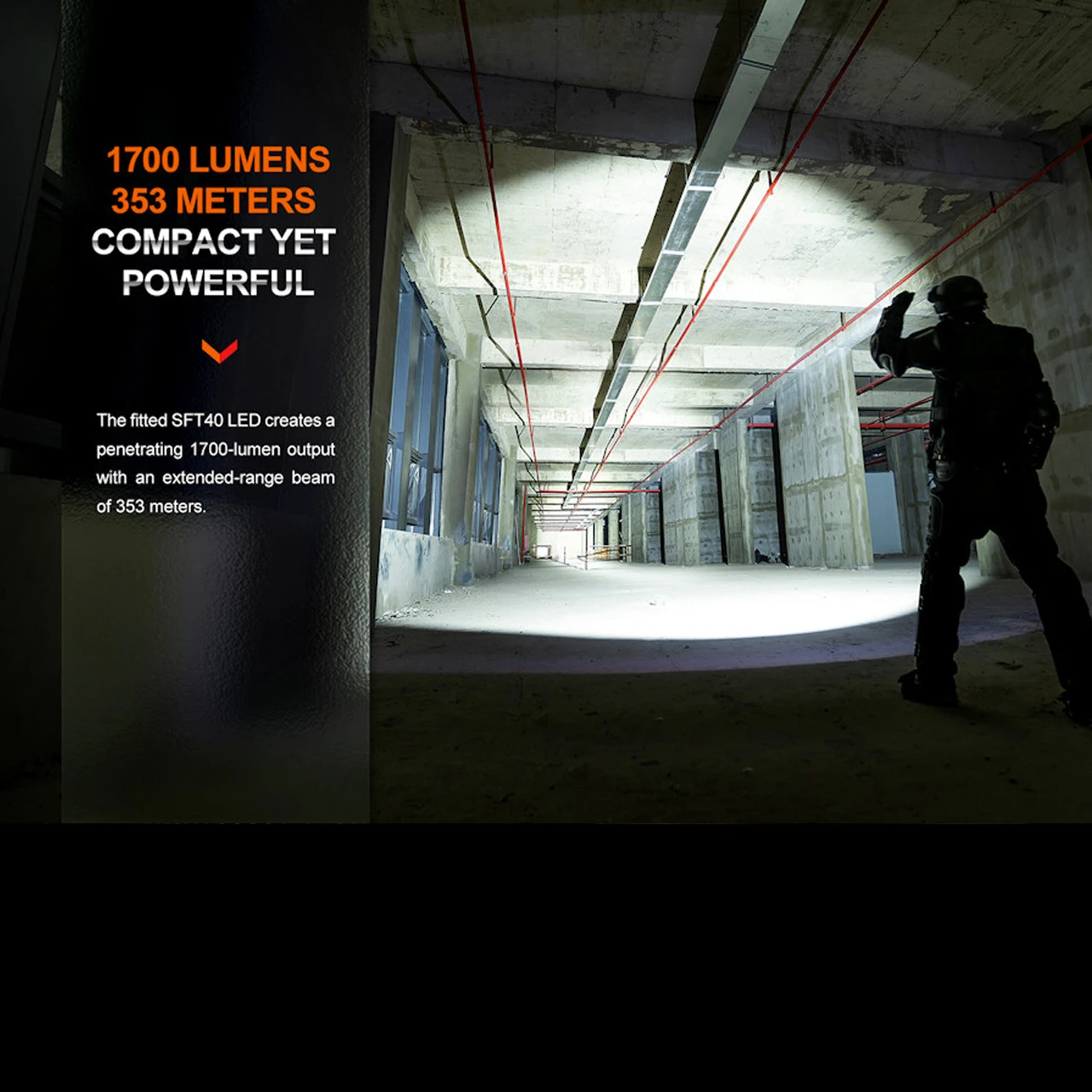 • Turbo: 1700 lumens (2 hrs 15 min inc temperature and battery level step downs) – 353m beam