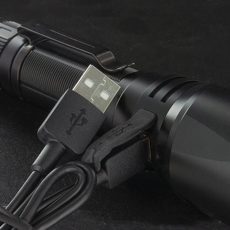 The Fenix TK26R torch has a maximum output of 1,500 lumens from the CREE Luminus SST-40 LED and can be powered by the included 18650 battery or by 2xCR123 (not supplied) in an emergency situation. The flashlight is rechargeable via a USB Type-C charging interface with a charging port towards the head of the light, please note this is only available when using an 18650 li-ion cell and must not be attempted if the CR123 cells are in use.