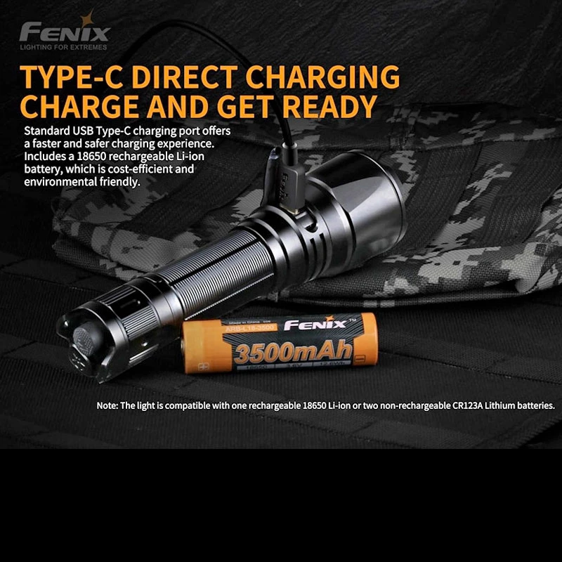 Includes: 1 x Fenix ARB-L18-3500 3500mAh Li-ion battery, USB type-C charging cable, lanyard, holster, spare o-ring, spare rubber boot switch.