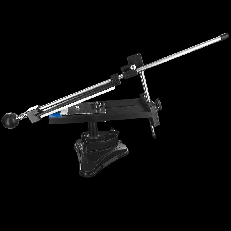 The base uses suction to securely attach to a table to make sure the equipment is rock solid. The angle of the grind is determined by the rod at the back of the sharpener which is secured into place with a screw. For larger blades a hand held technique works well allowing the user the freedom to move the edge to the position required. For smaller pocket knives a clamp blade cam be employed to secure the blade into place.