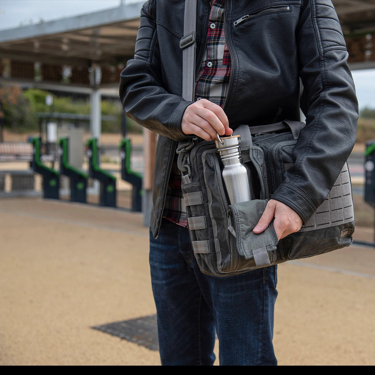 It is supplied with a detachable strap and can be worn on either side of the body and with either side facing outwards. One side features two zippered pockets, a bottle holder compartment with elasticated loops and a wider pocket with MOLLE panel and three internal sleeves. The main compartment has two hook and loop surfaces and a padded laptop sleeve measuring 30 x 26cm. The rear zippered sleeve has a hook and loop surface and two separate sleeves this area is ideal for folders, books etc.