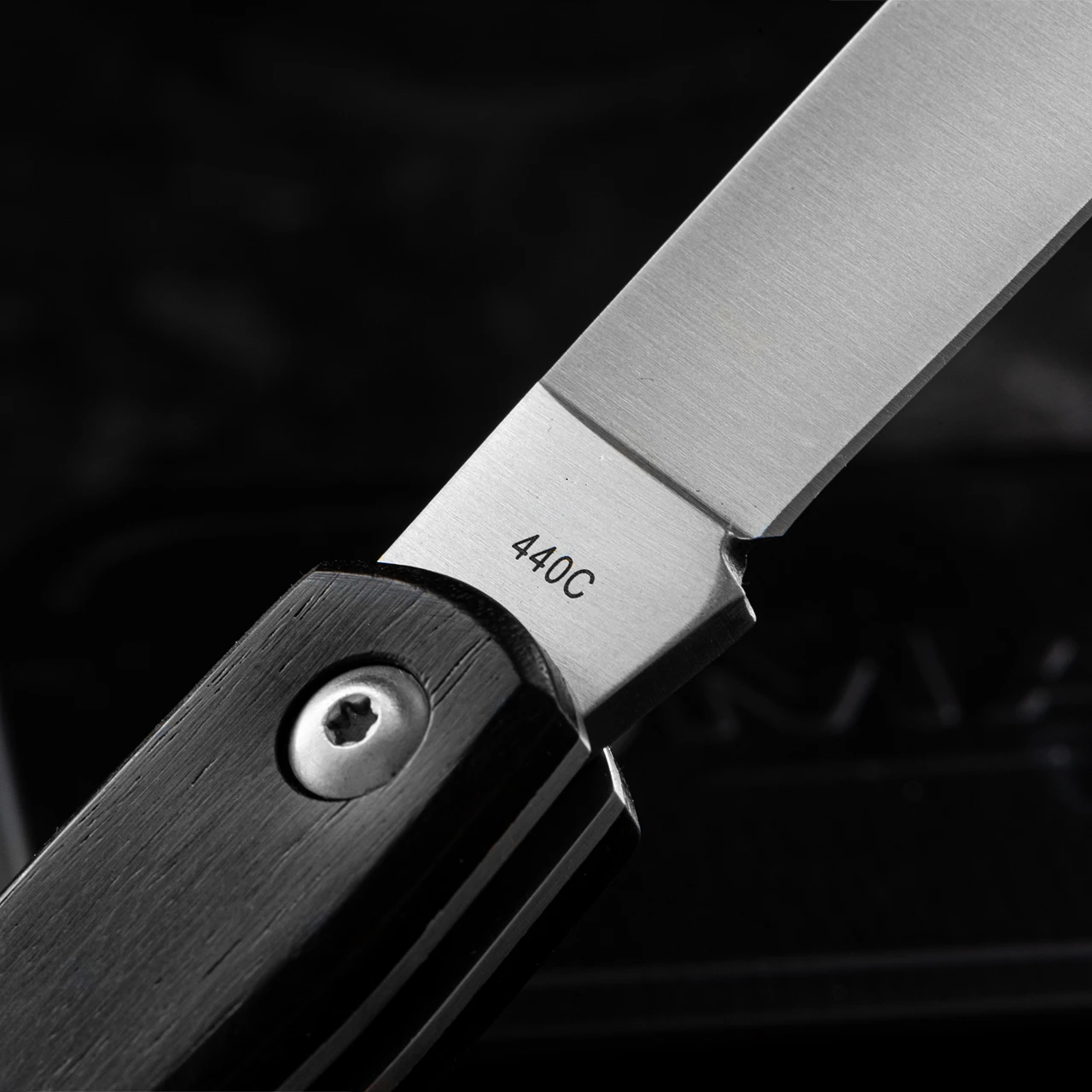 The satin-finished drop point blade is made of 440B stainless steel, opens with both hands with a nail nick and does not lock. The sturdy construction has ergonomically shaped handle scales made of dark ebony, which is extremely durable due to its high density.