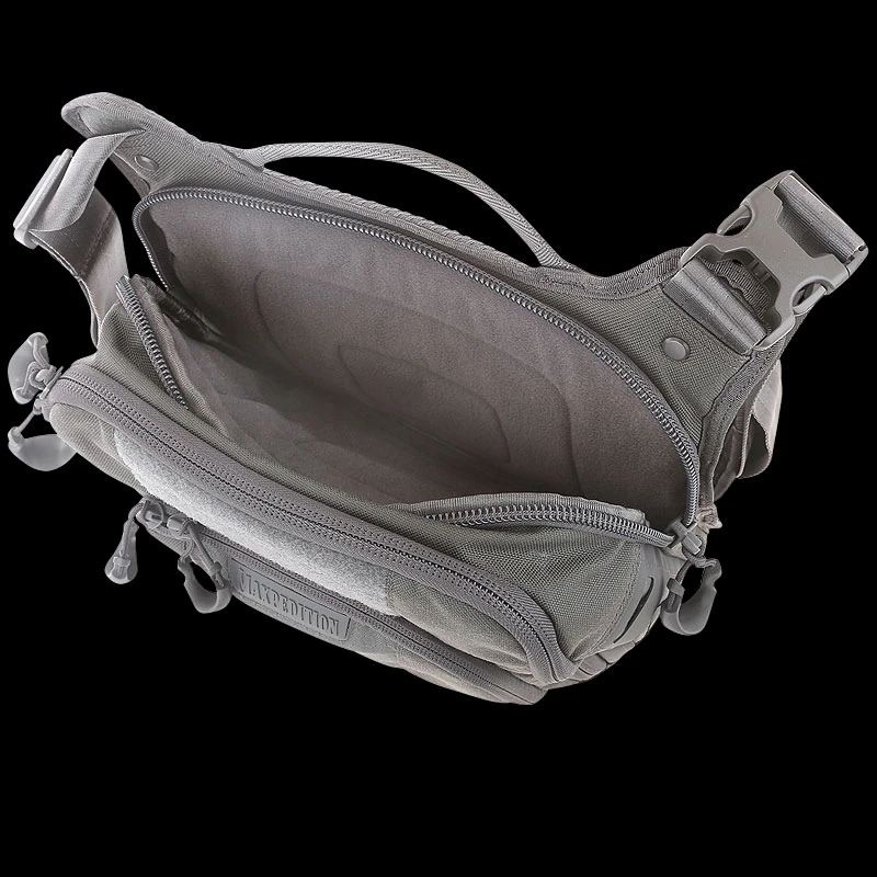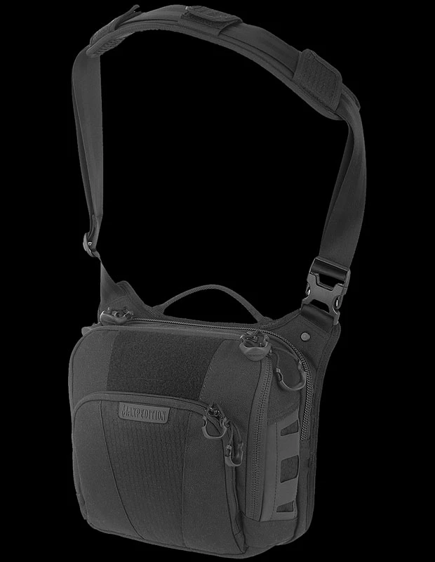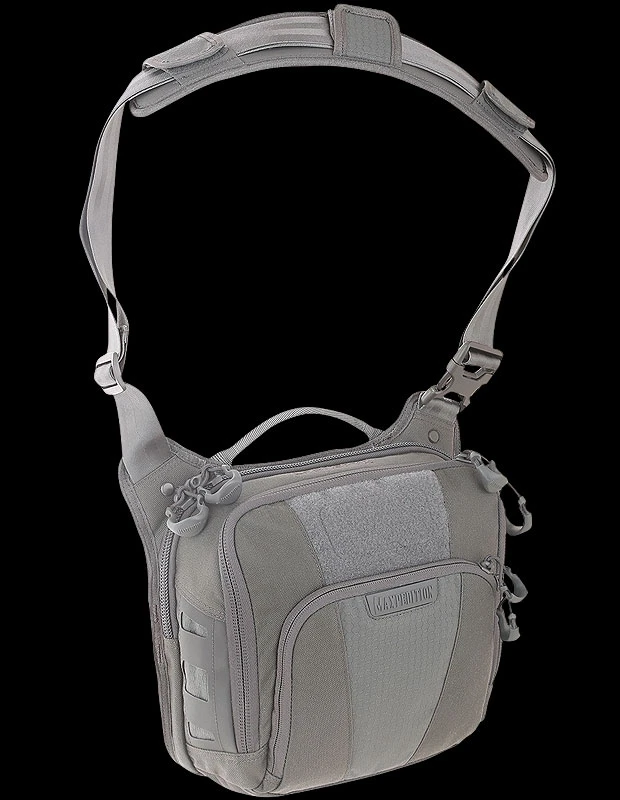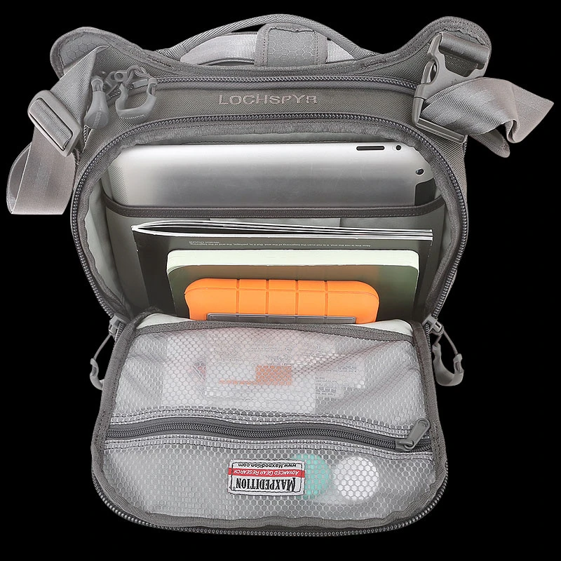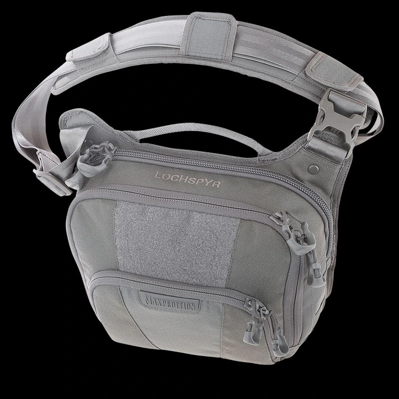 The Maxpedition LOCHSPYR (pronounced “LOCK-SPIRE”) is a crossbody shoulder bag optimized for carry. The rear CCW compartment is fully loop-lined and has an 16 inch U-shape zipper opening. The main compartment has a padded pocket sized to fit most tablets. There is an adjustable reinforced seatbelt webbing shoulder strap with quick release buckle and padded shoulder pad.