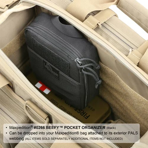 Maxpedition beefed up the FATTY POCKET ORGANIZER for increased capacity. The Beefy Pocket Organizer is the largest of its kind with optimum interior space for standard flashlights, hand tools, large knives, 16OZ bottles, heavy cables and other fuller-sized gear. A full clamshell opening reveals a hefty main compartment, containing 15 elastic dividers and 2 large slip & zippered pockets. This portable utility carry is perfect for big jobs and can be dropped into your Maxpedition bag or attached to its exterior PALS webbing for extended travels.