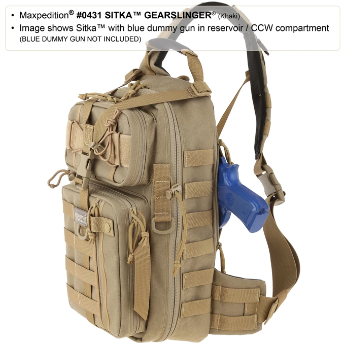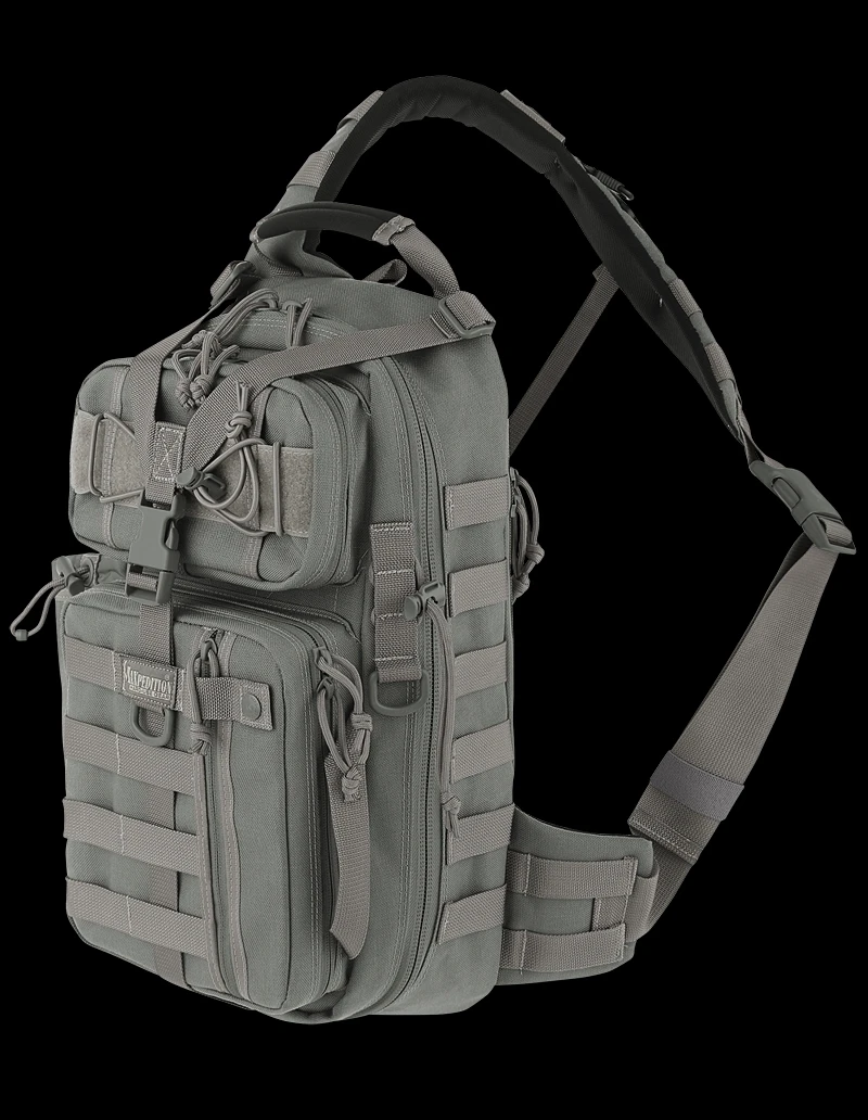 Single shoulder backpack designed to maximize utility when rotated towards front of body. Main compartment: 16.5 high x 8.5 wide x 3 thick with internal organization Top front: 7.5 wide x 4 high x 2 thick with internal organization Bottom front: 8 high x 7 high x 2 thick with internal organization Approximate Capacity: 618 cu. in. Main compartment and hydration compartment can accept CCW accessories Shoulder strap designed to go over left shoulder for better weapon shouldering Bag can be worn in front and contents comfortably accessed while sitting down Water bottle pocket sized to fit 32oz Nalgene bottle Compatible with 100oz hydration reservoir PALS modular webbing throughout to for attaching accessories Top and side handles