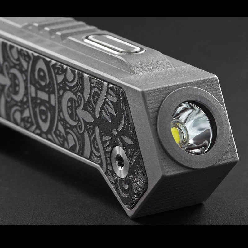 The MecArmy FL02 Lucky Monster is a keychain/pocket light of amazing quality. The body is TC4 Titanium with an intricately etched design on both sides of the body of the flashlight. This little beauty will certainly get heads turning and tongues wagging.