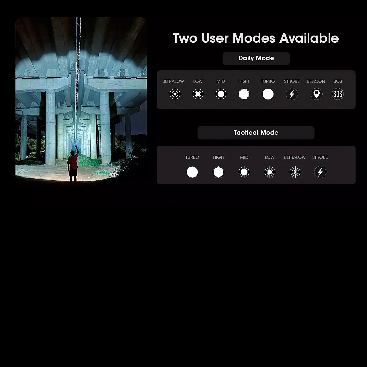Plus strobe, beacon and SOS (3300 lumens).