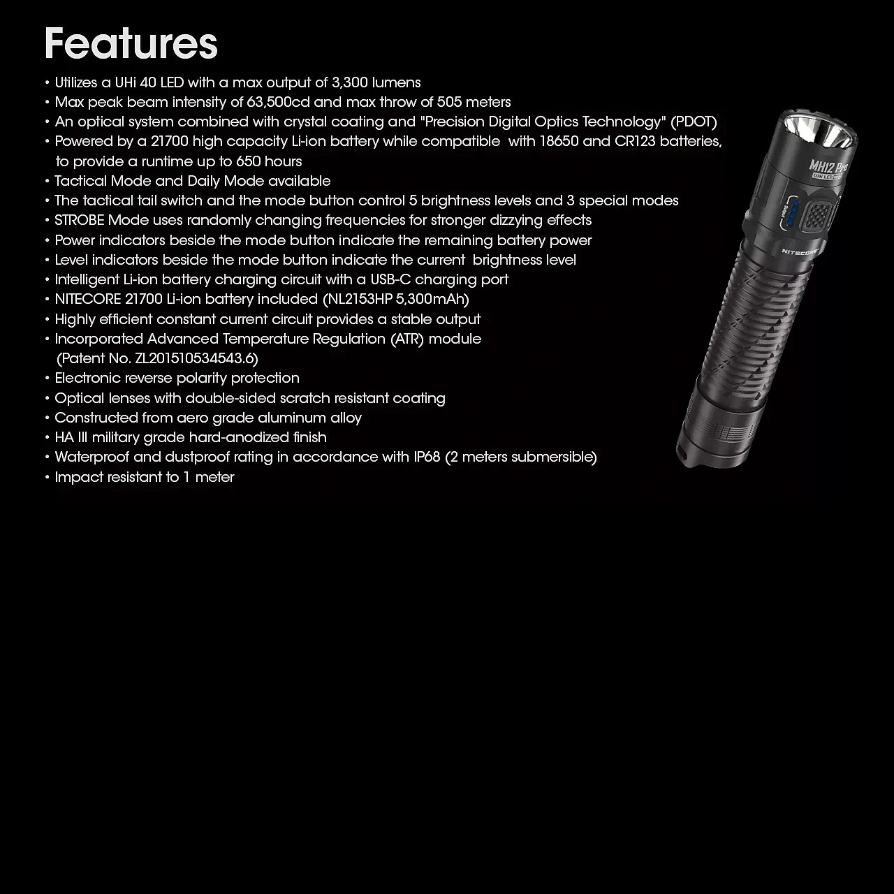 The Nitecore MH12 Pro flashlight has a maximum output of 3,300 lumens from the NiteLab UHi 40 LED and is powered by 1 x high capacity 21700 li-ion battery (Nitecore NL2153HP included). The light is rechargeable via a USB-C port on the head.