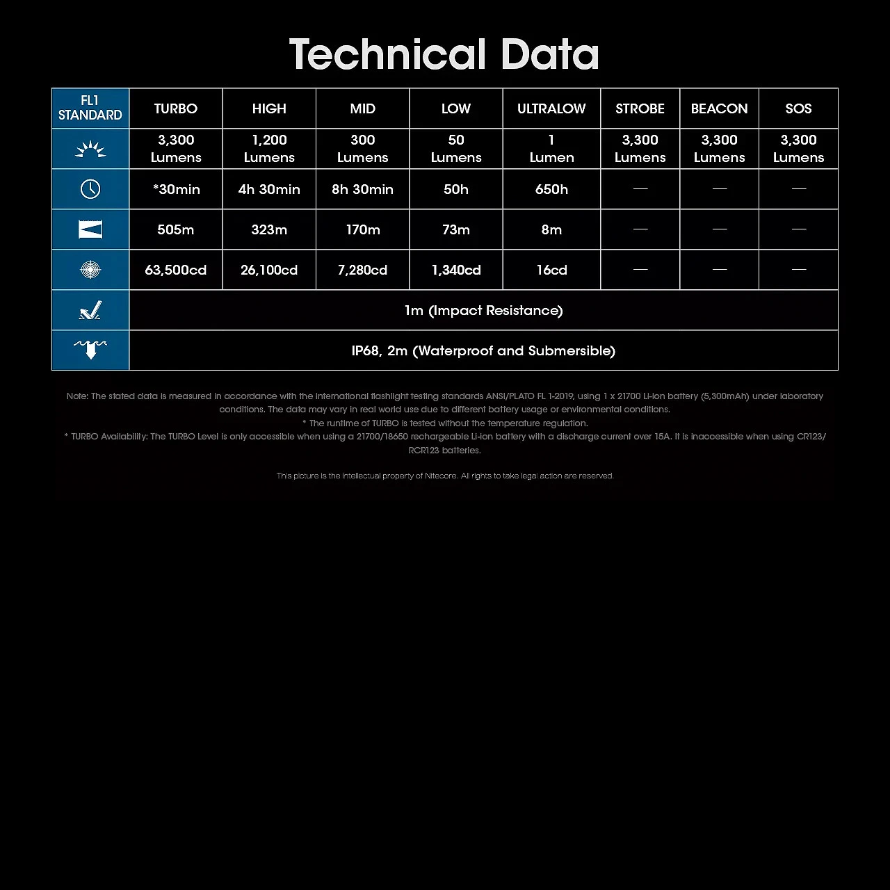 • Turbo: 3,300 lumens – 30 mins runtime*