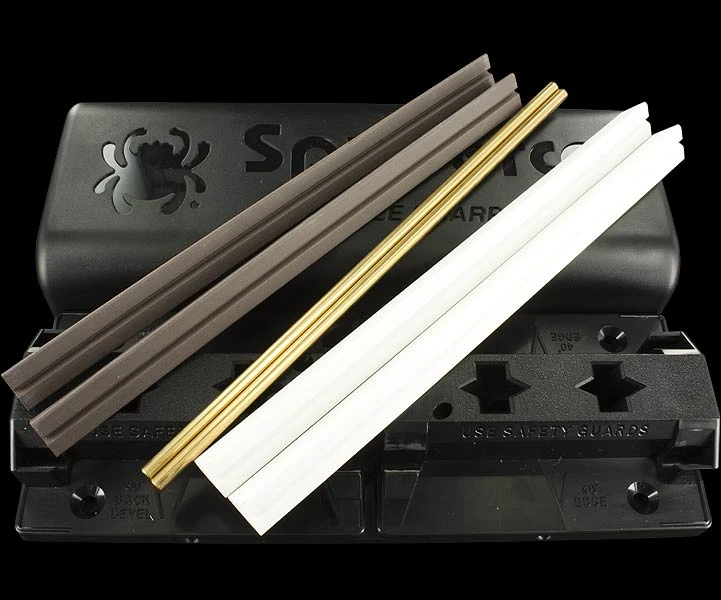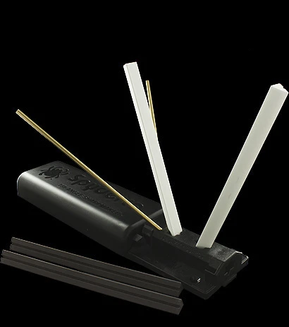 Spyderco’s Tri-Angle Sharpmaker is perhaps the ultimate knifesharpener. It includes two sets of high Alumina Ceramic stones: A pair of medium grit (dark) stones for aggressive sharpening, and a pair of fine stones (white) for professional grade finishing. There is also a set of brass safety rods to protect the user’s hand during sharpening.